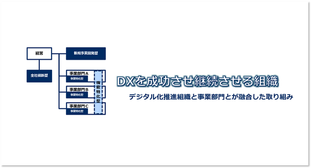 DXを成功させ継続していくためには、デジタル化推進組織と事業部門とが融合した取り組みが必要です。デジタル成熟度に応じた、けん引やサポート、事業部門には企業文化に根差した進化が必要です。
