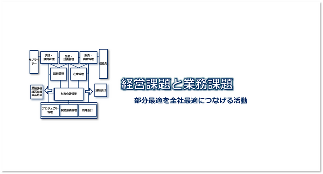 - 個々の業務の管理精度を向上し、業務間の情報を的確に連携することにより、部分最適を全社最適につなげる。